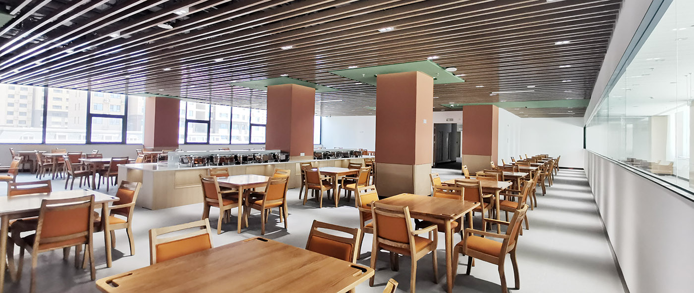 1.餐厅环境:餐厅整体环境宽敞明亮,通风良好,营造舒适就餐氛围。装修风格温馨典雅,采用柔和灯光,避免强光刺激。墙壁上挂有温馨的装饰画和书法作品,增添文化氛围。播放舒缓轻松的音乐,帮助长者放松心情,享受用餐时光。同时,餐厅设置多个就餐区域,满足不同长者社交需求,既设有多人共享大桌,方便长者们交流互动,增进邻里关系;也有私密单人或双人小桌,为喜欢安静用餐的长者提供选择。
