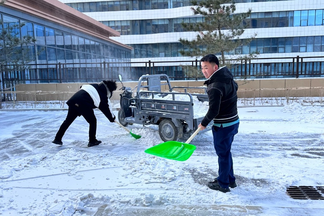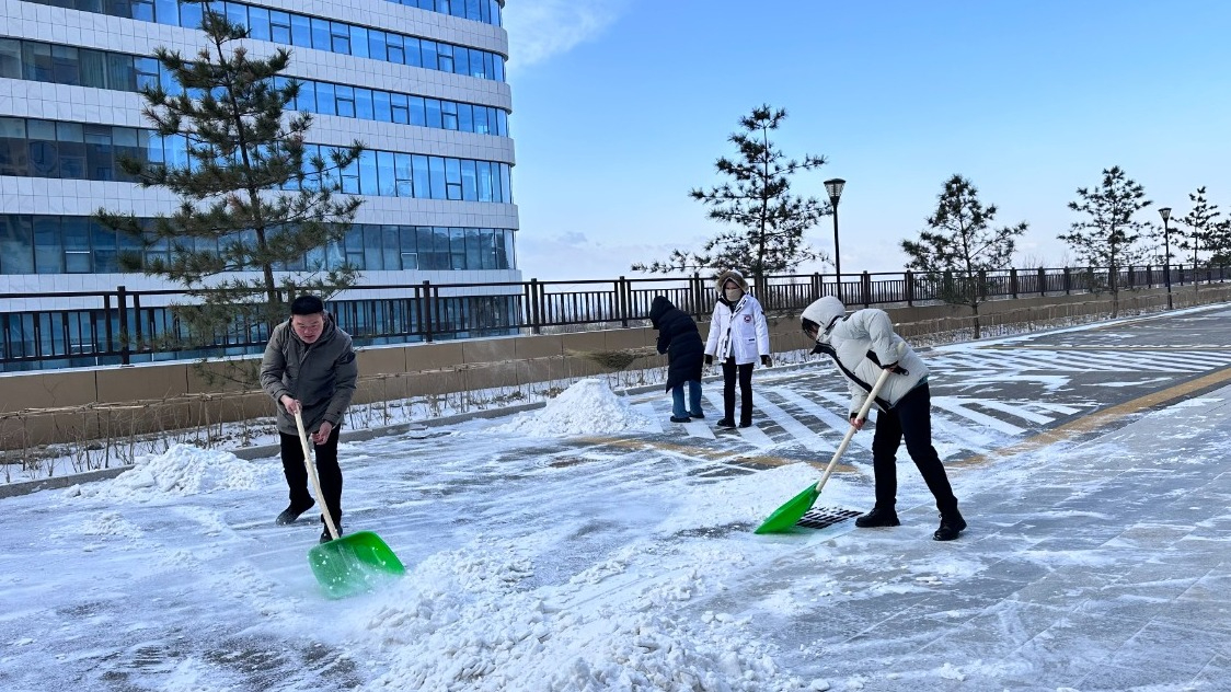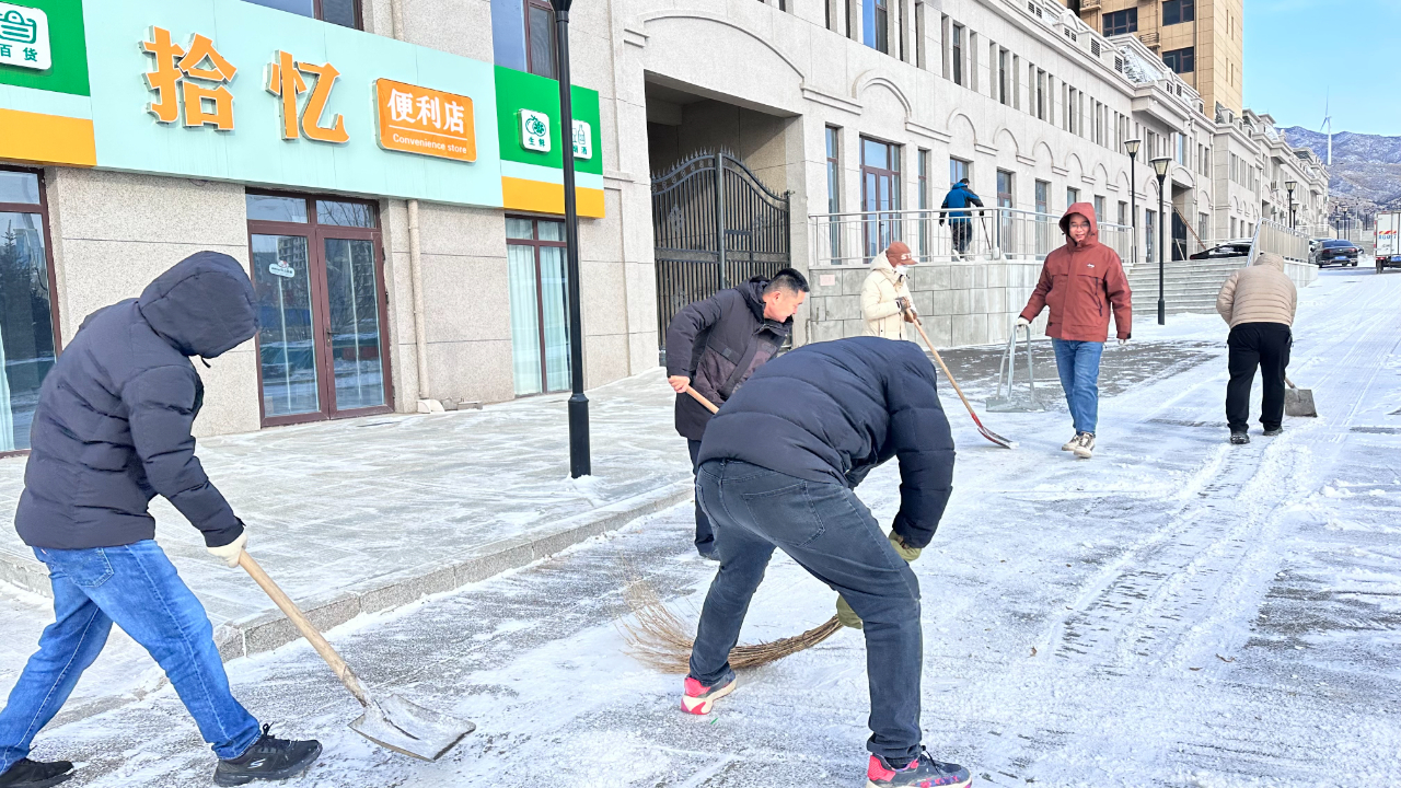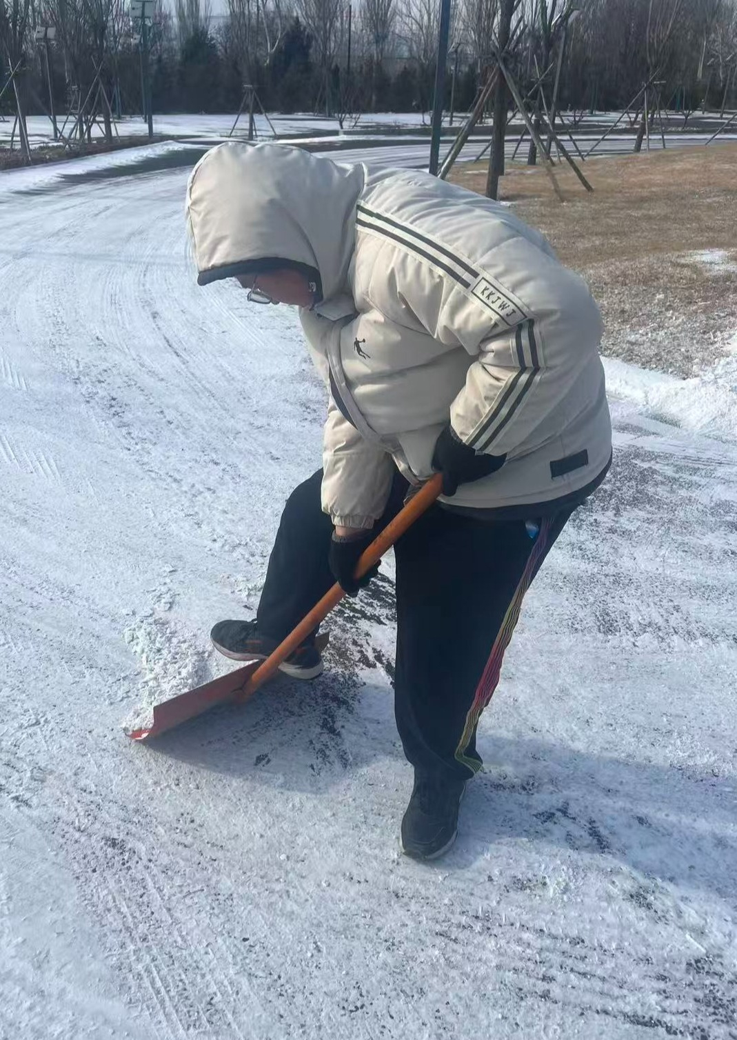 尽管寒风凛冽,雪花不时落在肩头、钻进衣领,但团员们的热情丝毫未减。年轻的身影在雪地里穿梭,有的弯腰铲除路面薄冰,有的挥动扫帚清扫积雪,确保每一处都清理到位、安全可达。大家配合默契,干劲十足,在劳动中践行“奉献、友爱、互助、进步”的志愿精神,也用实际行动诠释了项目“以长者为中心”的服务宗旨。